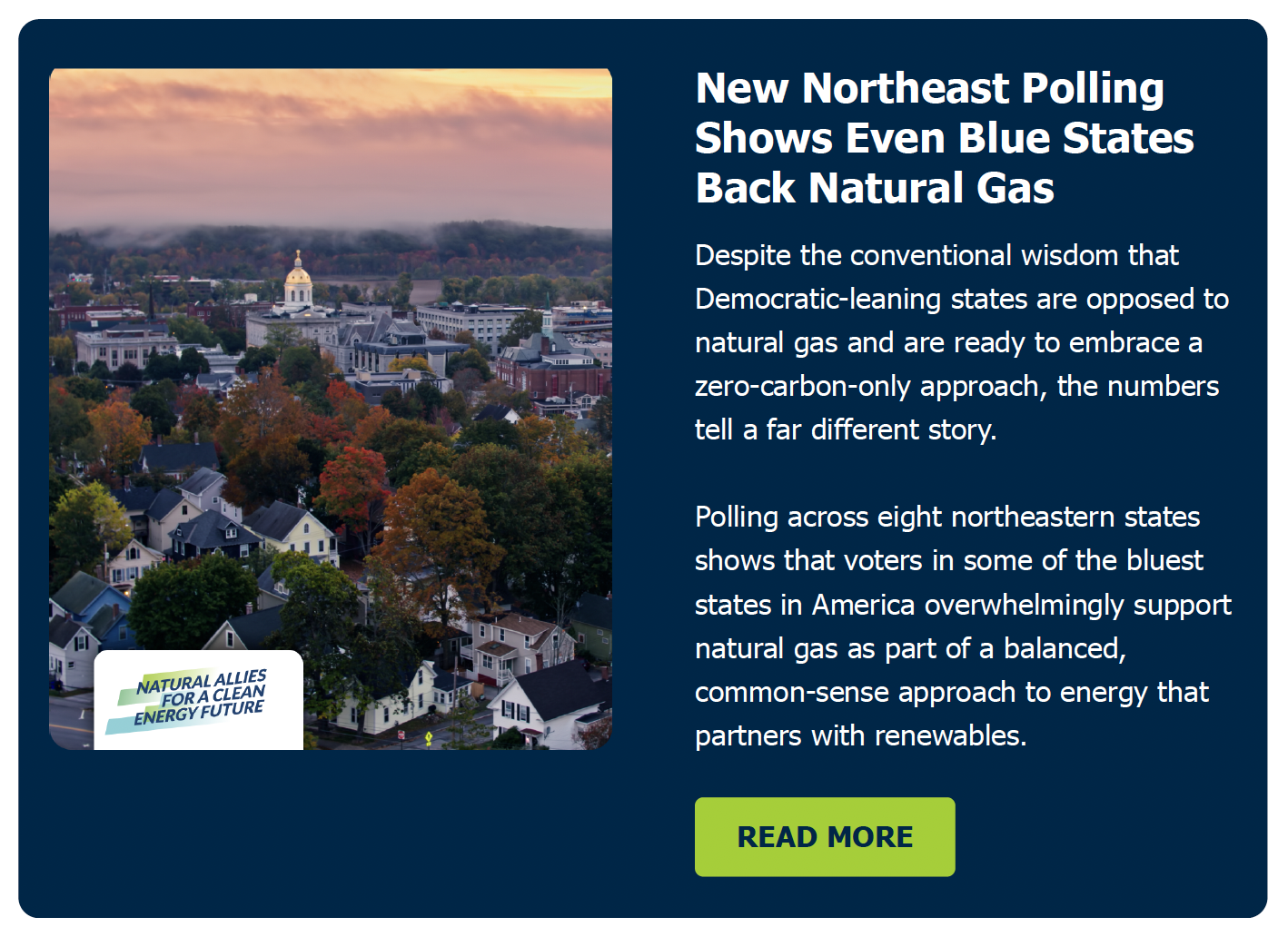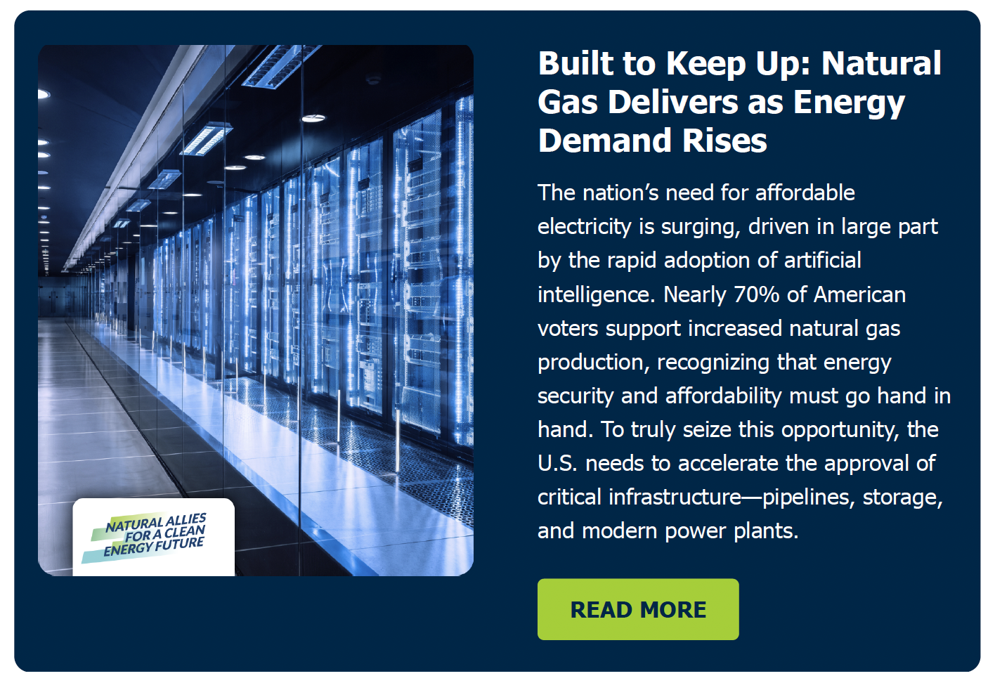 America’s energy demand is growing faster than ever, fueled by electrification and the rapid rise of artificial intelligence. Meeting this moment requires a balanced mix of resources that deliver reliable, affordable power while cutting emissions. Natural Allies for a Clean EnergyFuture believes that natural gas—working alongside renewables—is essential to keeping pace with these challenges and securing a cleaner energy future.